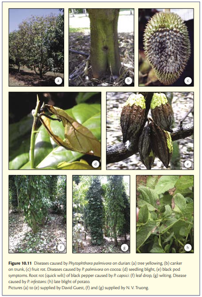 Các loài Phytophthora gây bệnh trên diện rộng ở Việt Nam trên cây ăn quả và rau, ruộng và cây công nghiệp. Các bệnh bao gồm thối rễ; bệnh thối thân và thối trái sầu riêng; bệnh thối rễ cây ớt; thối tim của dứa; thối chân (héo nhanh) tiêu đen; bệnh mốc sương hại khoai tây, cà chua; thối rễ, thân, quả của cây đinh lăng; chết dần cao su và các cây trồng khác.