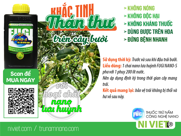 Trong giai đoạn cây bưởi đậu trái non, phun thuốc trừ nấm bệnh an toàn từ dinh dưỡng nano lưu huỳnh FUGI NANO-S có tác dụng chặn đứng bệnh thán thư trên hoa và trái non, bảo vệ vỏ bưởi không bị đốm do nấm bệnh phát triển mạnh và cung cấp dinh dưỡng lưu huỳnh cho cây.